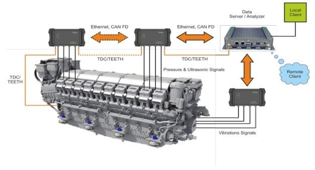 The engine data is synchronized to same signal taken from the shaft. Engine operation analysis is based on the following: -pressure;